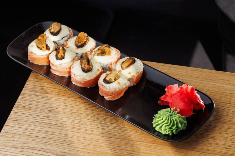Рис, норі, слабосолений лосось, огірок, сирна шапочка, м'ясо мідії, устричний соус, крем сир