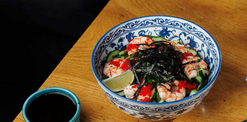 холодна пшенична локшина в горіховому соусі, з креветками, філе свіжого огірка, салатом чука та соломкою водоростей норі