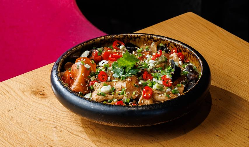 Ніжне куряче філе та смажена рисова локшина в соусі з солодкого чилі. З слайсами імбиря, моркви та болгарського перцю, грибами Мун, солодкою білою цибулею.