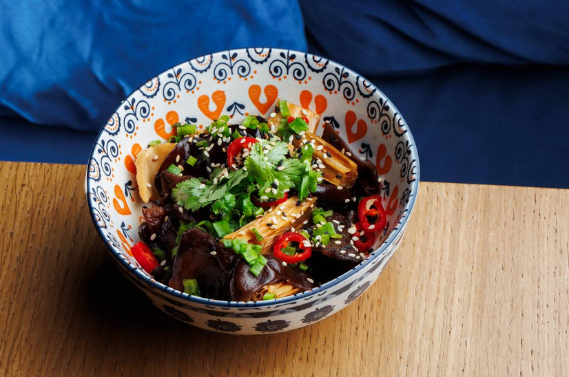 соєва спаржа фучжу з деревними грибами смажені з імбирем, часником та устричним соусом