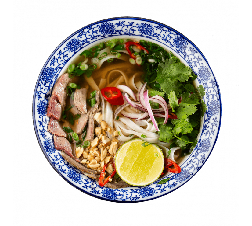 В'єтнамський м'ясний суп на основі яловичого бульйону з рисовою локшиною, синьою цибулею та міксом зелені (м'ята, базилік, кінза, зелена цибуля, свіжий чилі) Арахіс, лайм, відварна та сира яловичина, яка готується прямо в тарілці