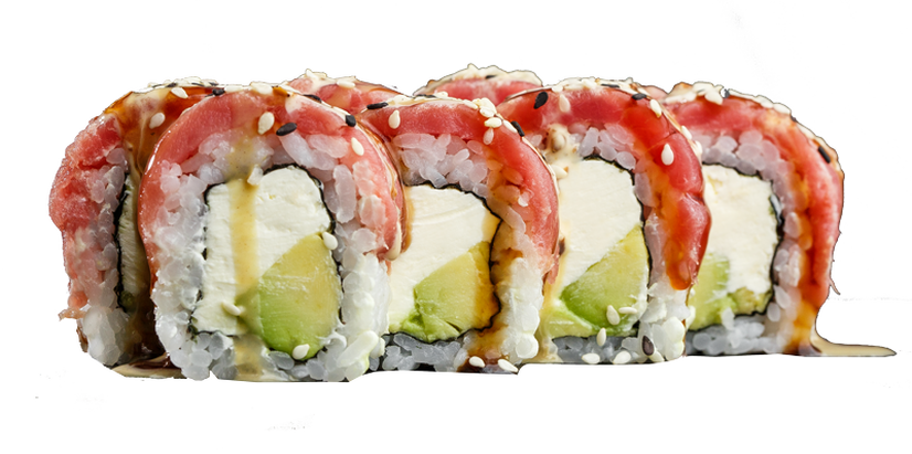 рис, норі, сир філадельфія, тунець, авокадо, устричний соус, паста тахіна, горіховий соус, кунжут