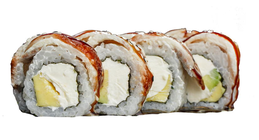 рис, норі, сир філадельфія, вугор, авокадо, унагі соус, паста тахіна, устричний соус, кунжут