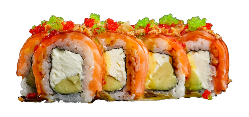 рис, норі, сир філадельфія, лосось, авокадо, ікра тобіко червона та зелена, унагі соус, манго соус, цибуля кріспі, кунжут